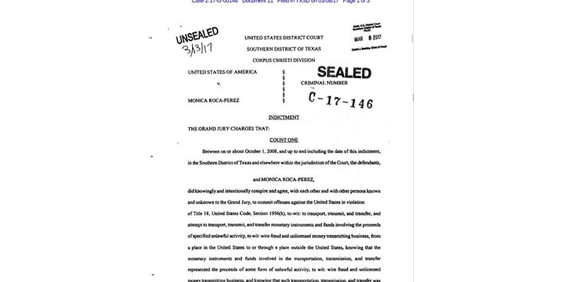 En la acusación criminal C-17-146, radicada en la Corte del Distrito Sur de Texas, con sede en Corpus, Christi, el Fiscal Kenneth Magidson, señaló a Roca Pérez de delitos como Transportar, transmitir y transferir, así como intentar transportar, transmitir y transferir instrumentos monetarios y fondos que involucren el producto de una actividad ilícita.