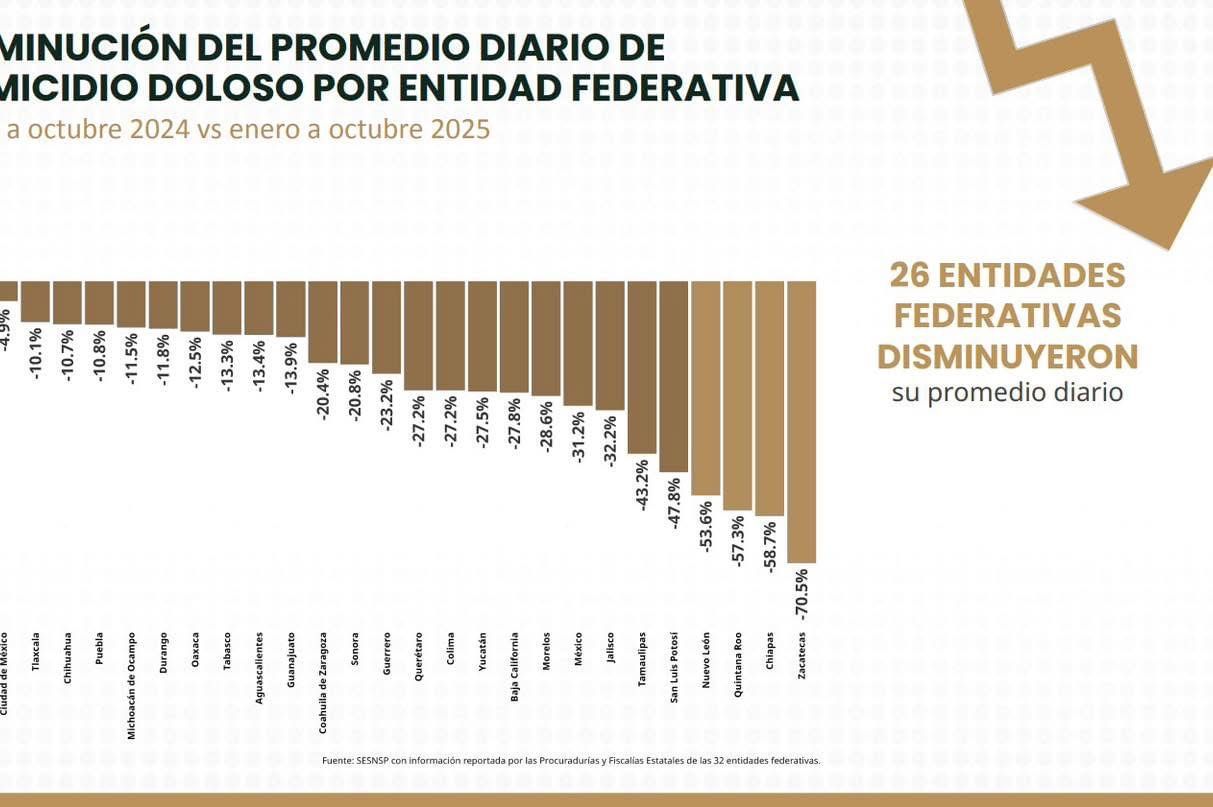 En este contexto, Tamaulipas se posicionó entre las seis entidades con mayor reducción en el promedio diario de homicidios dolosos, al registrar una disminución del 43.2% respecto al mismo periodo de 2024 (enero-octubre).