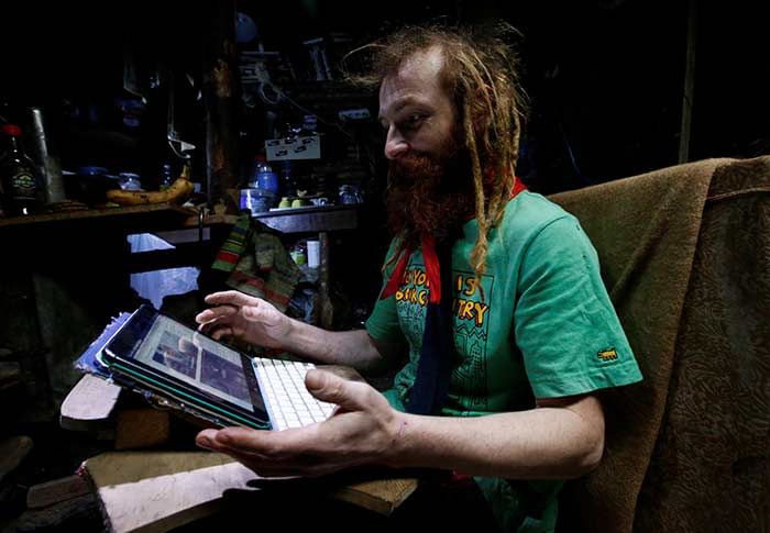 Su vivienda subterránea cuenta con todo lo necesario y hasta un poco más: una copiosa biblioteca, una estufa de leña, especias para cocinar sopas, una tablet con la que revisa su Facebook y se comunica con el mundo exterior, una ducha y un sauna de barro.